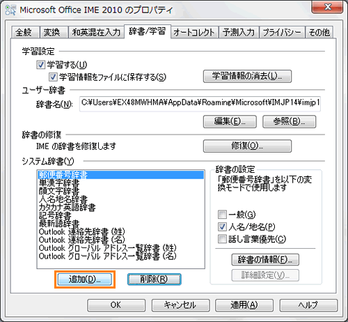 - 「Microsoft Office IME 2010のプロパティ」の「辞書/学習」タブ画面に戻ります。