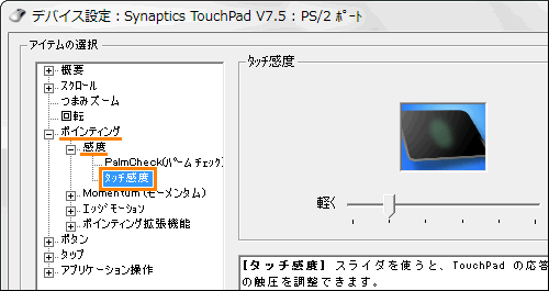 - 右側に”タッチ感度”の設定画面が表示されます。スライダーをマウスの左ボタンでクリックしたまま左右に移動して感度を調節します。