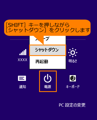 - [SHIFT]キーを押しながら[シャットダウン]をクリックして電源を切ります。 [シャットダウン]をクリックするまでの手順については、[014708:パソコンの電源を切る(シャットダウンする)方法<Windows 8.1>]を参照してください。