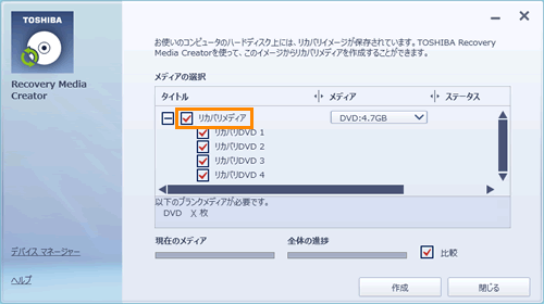 ※作成する必要のないリカバリーメディアがある場合は、リカバリーメディアの一覧からチェックをはずしてください。
