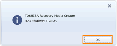 - 「TOSHIBA Recovery Media Creator」画面に戻ります。”リカバリUSBメディアの作成が完了しました。すべての処理が終了しました。”メッセージが表示されていることを確認し、[閉じる]ボタンをクリックします。