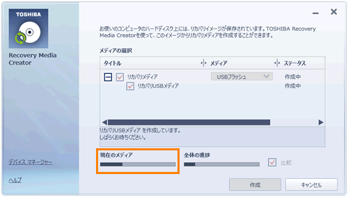 - 作成が開始され、”現在のメディア”に、作成しているリカバリーメディアの進捗状況が表示されます。