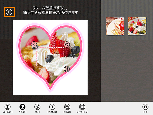 b.編集画面が表示されます。画面下に表示しているアプリバーの[フレーム選択]をクリックします。