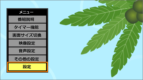 - 「メニュー」画面が表示されます。”設定”項目を選択して、リモコンの[決定]ボタンを押します。