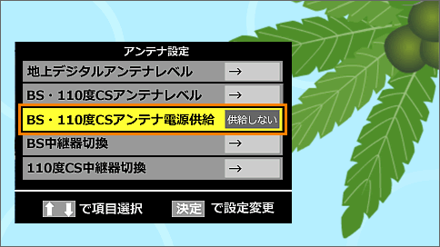 - 「アンテナ設定」画面が表示されます。”BS・110度CSアンテナ電源供給”項目を選択してリモコンの[決定]ボタンを押します。