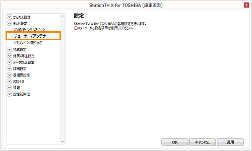- 「StationTV X for TOSHIBA[設定画面]」が表示されます。画面左側の一覧から[テレビ設定]をクリックします。