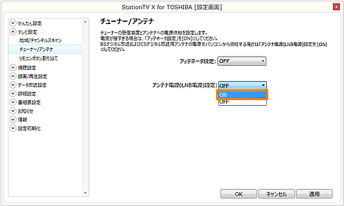 - 画面右側に「チューナー/アンテナ」画面が表示されます。”アンテナ電源(LNB電源)設定:”項目のボックスをクリックします。